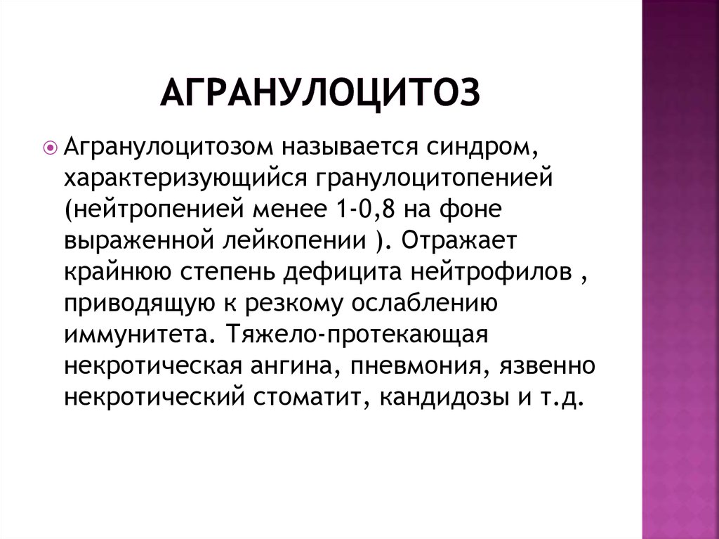 | Что такое агранулоцитоз? | Редкое, но серьезное состояние, характеризующееся резким снижением количества гранулоцитов (нейтрофилов, эозинофилов, базофилов) в крови, особенно нейтрофилов (менее 0,5 x 10^9/л). | Критически низкий уровень нейтрофилов делает организм крайне уязвимым к инфекциям. |