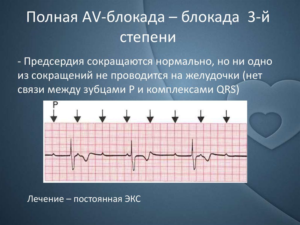 - третья степень (полная АВ блокада) проявляется полным разобщением работы предсердий и желудочков.