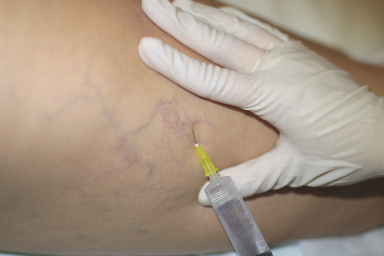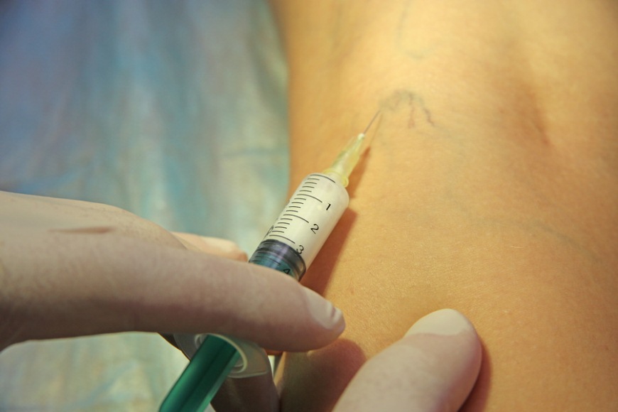 - Склерозирующих веществ с добавлением углекислого газа, который превращается в стабильную пену путем перекачивания из одного шприца в другой. Взаимодействуя, эти компоненты разрушают эндотелий капилляров, вызывая химический ожог. Воспаленные стенки сосудов сближаются, слипаются и образуют рубцы. Инъекция осуществляется с помощью катетера.