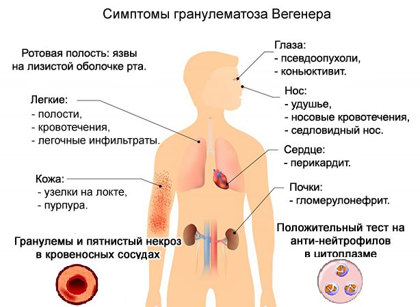 При отсутствии адекватного лечения болезнь Вегенера может привести к летальному исходу в течение 6-12 месяцев. Локальная форма заболевания может вызвать различные проблемы с глазами, ушами, носовой полостью и ее пазухами. В случае генерализованной формы основное поражение наблюдается в легких и почках. Развивается легочный гранулематозный васкулит, в легких образуются гранулемы, которые нередко распадаются, формируя кровоточащие каверны.