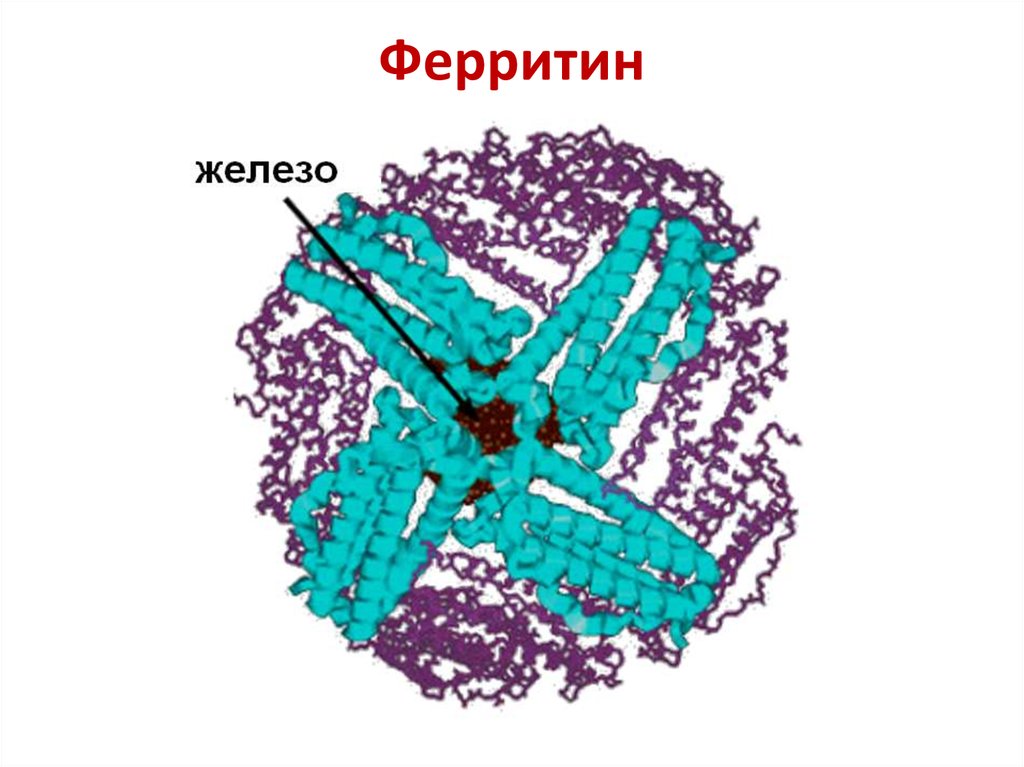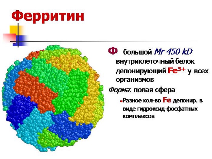 Железопротеид представляет собой соединение, состоящее из белкового элемента – апоферритина и трехвалентного железа. Одна молекула этого вещества способна удерживать до 4 тысяч атомов железа в форме фосфатного гидрооксида. Ферритин является компонентом безопасной формы гемоглобина. Свободные молекулы железа могут быть токсичными для организма человека, в то время как в ферритине железо связано и находится в растворимой, нетоксичной форме. Основные функции ферритина включают: