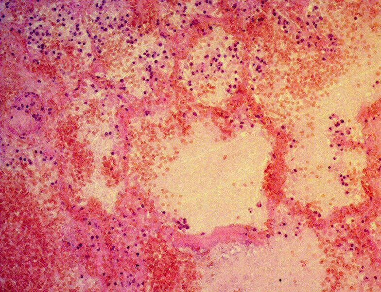 Чаще всего закупорка происходит в нижней доле правого легкого. В области сужения просвета наблюдается повышение давления в кровотоке, и с каждым сердечным сокращением может произойти инфаркт. Со временем зона поражения увеличивается, что повышает риск разрыва артерии. Стенки сосудов становятся тоньше, кровь может просачиваться в межклеточное пространство, и не исключено, что она попадет в легкие, что запускает воспалительный процесс.