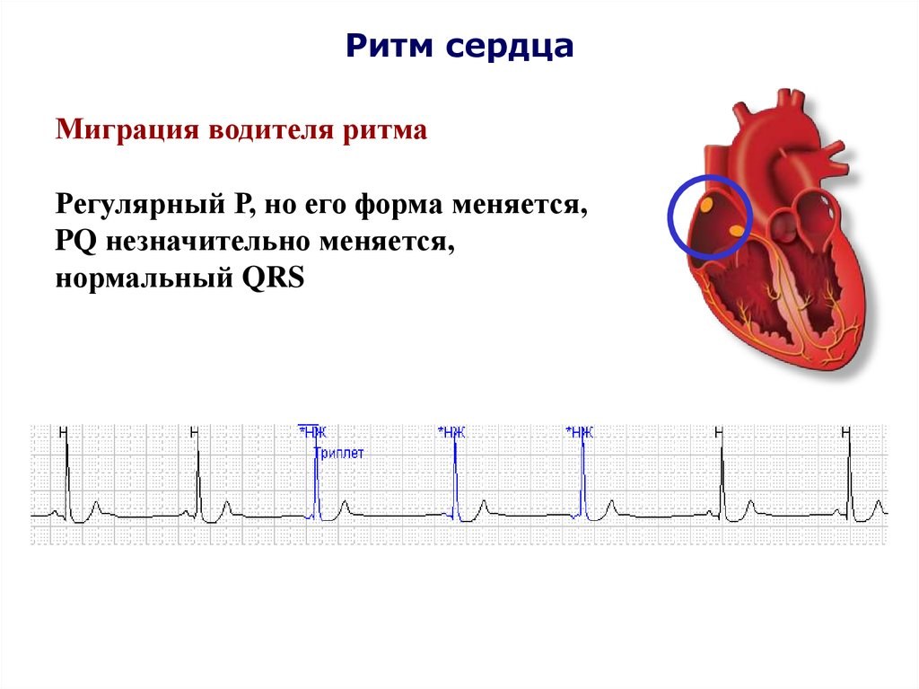 | Признак | Миграция водителя ритма по предсердиям | Нормальный синусовый ритм |