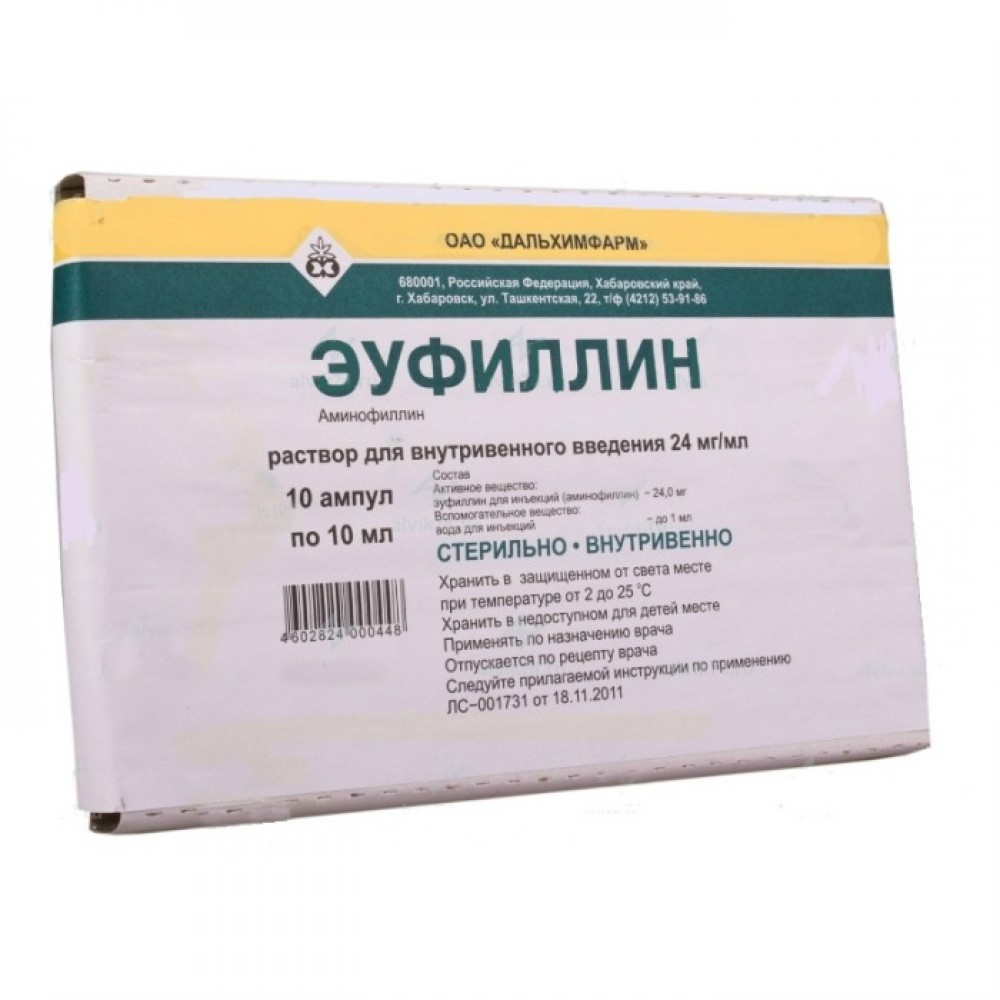 - Эуфиллин – бронхолитик, ингибитор фосфодиэстеразы. Это препарат из группы ксантинов, который расширяет бронхи и расслабляет их гладкие мышцы.