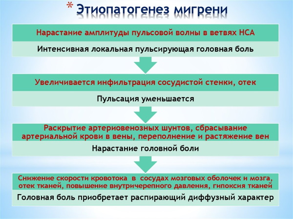 Мигрень возникает, когда длительное сужение сосудов резко сменяется их расширением. Обычно она начинает проявляться у людей в возрасте от 20 лет и старше. Симптоматика мигрени включает в себя давящую, тупую головную боль, которая не имеет четкой локализации, а также тошноту, иногда рвоту, слабость и раздражительность. У некоторых пациентов мигрень может проявляться в виде острого, пульсирующего болевого синдрома. Приступ мигрени проходит в три стадии. Первая стадия, продолжающаяся около 30 минут, характеризуется отсутствием боли и началом постепенного сужения сосудов. Во второй стадии сосуды расширяются, что приводит к появлению головной боли. Третья стадия сопровождается отеком в области сосудов и тупой головной болью.