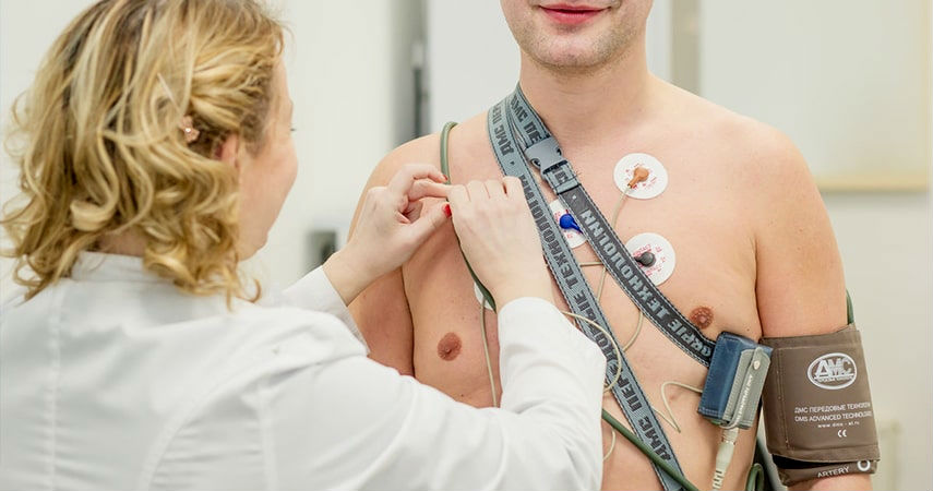 - Холтеровское мониторирование. Для этого используется портативный прибор с электродами, который следит за работой сердца в течение 24 часов или даже до 5-6 дней.