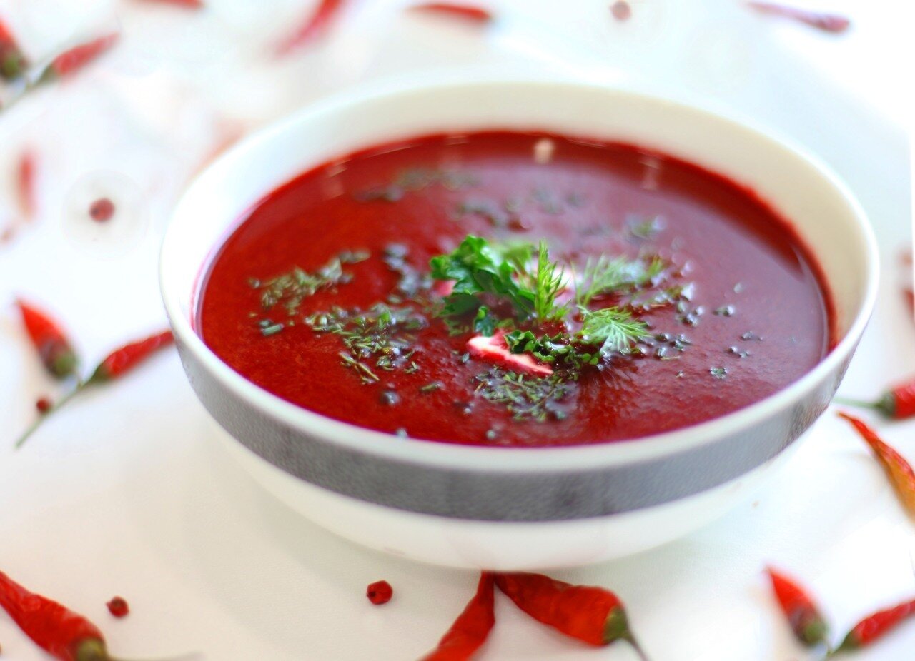- На обед — свекольный суп, вареная рыба, тушеные овощи, ломтик хлеба из цельнозерновой муки и стакан свежевыжатого морковного сока.