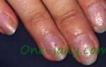 - четкая граница, разделяющая ноготь на две части (белую и розовую);