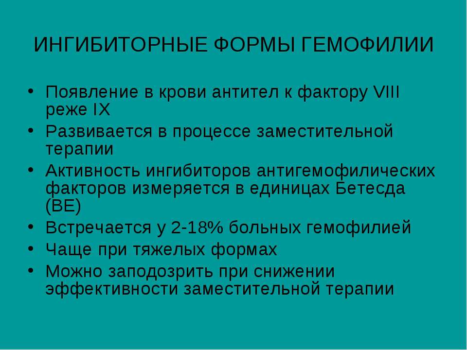 Данная форма заболевания приводит к серьезным осложнениям, относящимся к типу «А». При ее возникновении у пациента заместительная терапия либо полностью отсутствует, либо значительно снижается. К сожалению, не существует эффективных методов профилактики ингибиторной формы болезни. Лечебные схемы сопровождаются множеством ограничений. Обычно такая тяжелая форма заболевания диагностируется до достижения пациентом пятилетнего возраста.
