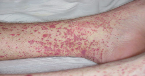 Это, в свою очередь, может вызвать гиперкоагуляцию и выход крови в виде отдельных элементов из сосудистого русла. В результате образуются микротромбы под кожей, что и проявляется в виде геморрагической сыпи.