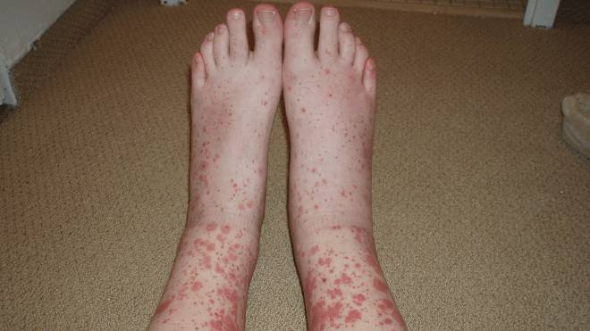 - Алые, красные, ярко-кумачовые, интенсивного оттенка называются петехиями и обычно располагаются на ногах. Они представляют собой мелкую точечную сыпь, вызванную повреждением капилляров. Хотя нижние конечности – это наиболее распространенное место для таких высыпаний, они могут появляться и в других областях.