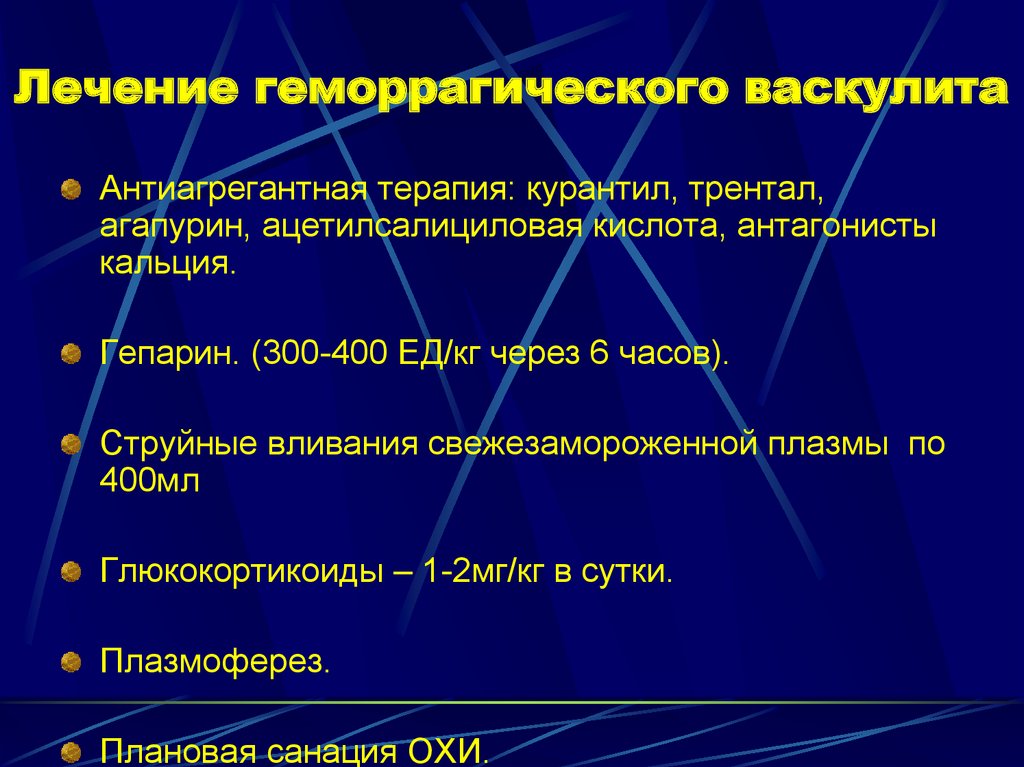 Терапевтические подходы к лечению геморрагического васкулита зависят от его клинической формы. Затяжная, острая, молниеносная или рецидивирующая форма заболевания требует применения специфических методов терапии. В период обострения необходимо срочное госпитализация, санация всех инфекционных очагов, а также использование антикоагулянтов, аспирина, блокаторов и антагонистов тромбиновых рецепторов, ингибиторов тромбоксансинтетазы.