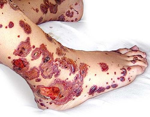 Тяжелая форма характеризуется обширными высыпаниями, некротическими элементами, рецидивирующими ангионевротическими отеками, сильными болями в области живота, желудочно-кишечными кровотечениями, наличием крови в моче и нефротическим синдромом.