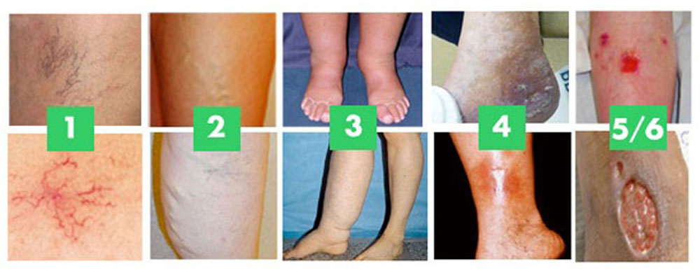 Пятая и шестая степени – появляются пигментные пятна, кожа становится сухой, возникают воспалительные процессы, вены увеличиваются, а также могут образовываться трофические язвы и некроз. При ходьбе возникают боли в икрах. На этой стадии следует ограничить физическую активность, избегать длительного стояния и интенсивных тренировок.