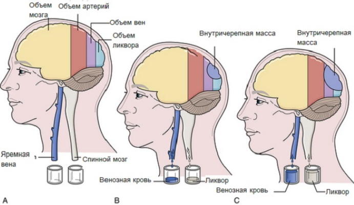 Это давление внутри черепной полости, которое формируется благодаря тканям мозга, внутримозговой жидкости и объему крови, циркулирующей по сосудам головного мозга. В черепной коробке находится множество этих структур, и их совокупные показатели определяют общее состояние. Внутреннее давление может как снижаться, так и повышаться, что негативно сказывается на качестве жизни и может приводить к появлению опасных симптомов. При наличии мозговой гипертензии нарушается отток жидкости, в результате чего клетки мозга начинают отекать. Они переполняются спинномозговой жидкостью – ликвором, который постоянно движется в желудочках головного мозга, подпаутинном пространстве и ликворопроводящих путях.
