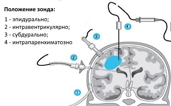 | Эпидуральный датчик | Датчик помещается в эпидуральное пространство (между черепом и твердой мозговой оболочкой). | Наименее инвазивный из инвазивных, но наименее точный. |