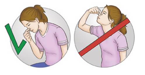 | 3 | Зажмите ноздри | Большим и указательным пальцами плотно зажмите мягкую часть носа (ниже костной перегородки) на 10-15 минут. |