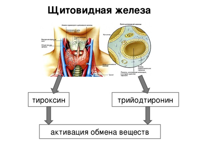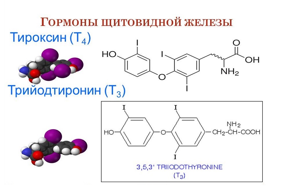 По сигналу гипоталамуса ТТГ активирует процесс присоединения атомов йода, содержащихся в щитовидной железе, к аминокислотам. Если к молекуле присоединяются 4 атома йода, в кровь попадает тироксин (Т4), а если 3 атома – образуется трийодтиронин (Т3). По своей структуре эти гормоны идентичны и относятся к белковым соединениям, различие заключается лишь в количестве йода.