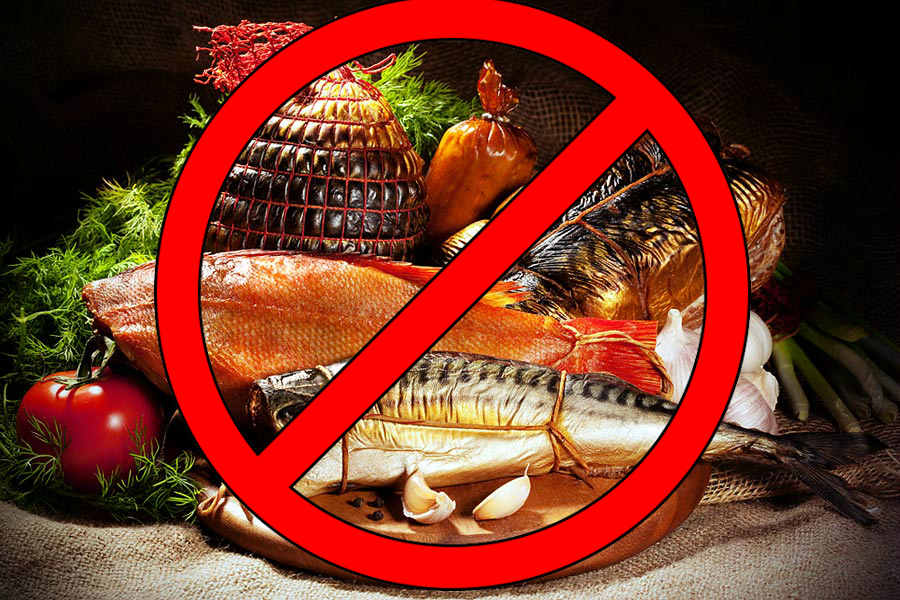 Коррекция рациона питания включает в себя уменьшение потребления жидкости и соли, поскольку они увеличивают нагрузку на сердце. Для замедления атеросклеротических процессов, снижения уровня «вредного» холестерина и уменьшения массы тела рекомендуется придерживаться диеты с ограничением жиров. По возможности стоит полностью исключить из рациона следующие продукты: