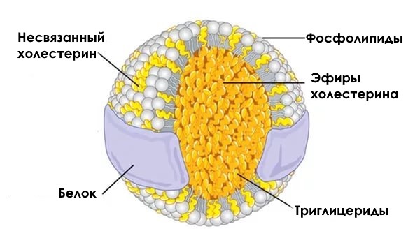 - липопротеины низкой плотности (ЛПНП). Состоят из холестерина и белка, их диаметр варьируется от 18 до 26 нанометров, при этом холестерин преобладает над белком;
