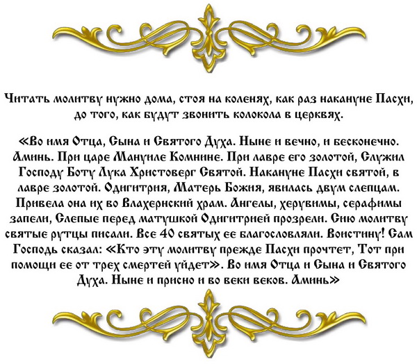 Этот заговор произносится исключительно утром в день Пасхи. Перед его чтением рекомендуется произнести молитву «Отче наш» и трижды произнести заговоренные слова: