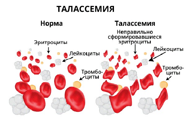 Данный термин охватывает целую категорию генетических заболеваний, при которых нарушается естественный процесс синтеза бета-цепей белка. К таким заболеваниям относится гемолитическая анемия, которая может препятствовать нормальному развитию здоровых эритроцитов. В результате этого клетки крови погибают в костном мозге и селезенке, что приводит к накоплению в крови избыточного количества несвязанного железа. В организме происходит накопление фетального гемоглобина, что приводит к недостатку кислорода в тканях.