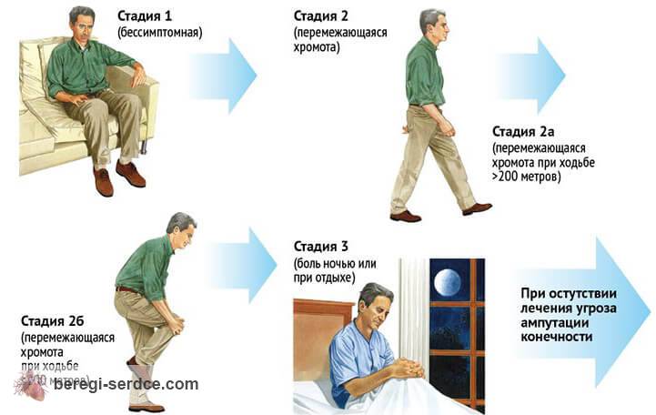 Течение облитерирующего атеросклероза сосудов нижних конечностей можно условно разделить на четыре стадии. Симптоматика каждой из них зависит от причин, приведших к развитию заболевания, и влияет на подходы к лечению.