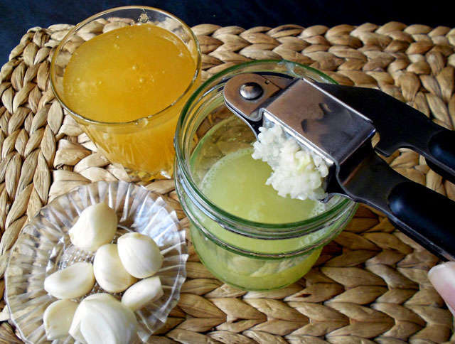 - Смешать сок одного лимона, 1-2 зубчика измельченного чеснока и 1-2 столовые ложки меда.