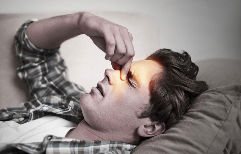 Боль ощущается в области лба и над бровями, может отдавать в уши и челюсть. У пациентов также наблюдаются повышение температуры и насморк с гнойными выделениями. Лицо может отекать, нос становится заложенным, а обоняние и вкус ухудшаются.