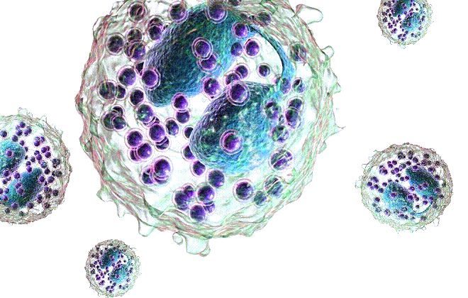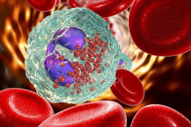 Базофилы образуются в костном мозге и составляют примерно 1% от общего числа лейкоцитов. В течение 120 минут после своего формирования они попадают в ткани с кровотоком, где остаются на 10-14 дней. Этот период достаточно для их участия в различных патологических процессах. Абсолютное содержание базофилов в крови может указывать на их концентрацию у детей. У человека они выполняют следующие функции: