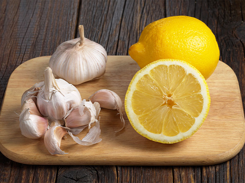 - Две головки чеснока очищают и превращают в кашицу. То же самое делают с двумя лимонами. Полученные массы тщательно перемешивают. Затем в чесночно-лимонную смесь добавляют столовую ложку оливкового масла. Принимают это средство до еды по одной столовой ложке. Курс лечения составляет 30 дней.