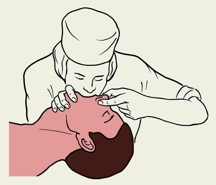 - «Рот в рот». Зажмите нос пациента, глубоко вдохните и выдохните воздух через рот.