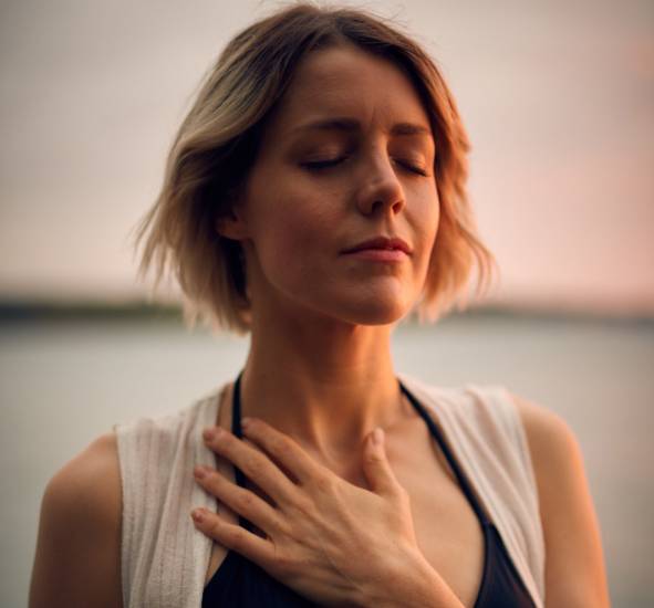 - Выполните дыхательное упражнение: сделайте глубокий вдох, задержите дыхание на несколько секунд, сосредоточившись на области груди, затем выдохните. Повторите это 6-8 раз.