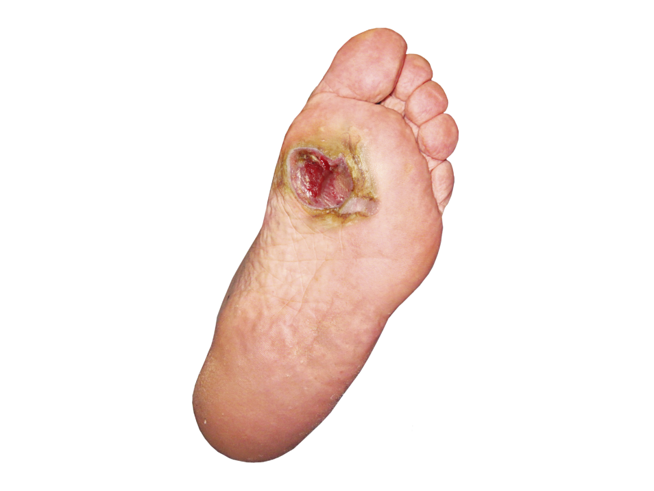 нейротрофические. Эти язвы формируются на подошве в области пяточного бугра или на боковой поверхности пятки. Они выглядят как глубокие, но узкие впадины с гнойным содержимым;