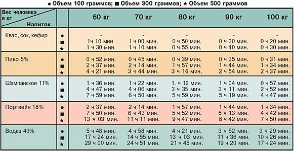 | Пиво (5% об.) | 2-4 | Вес, пол, метаболизм, количество выпитого |