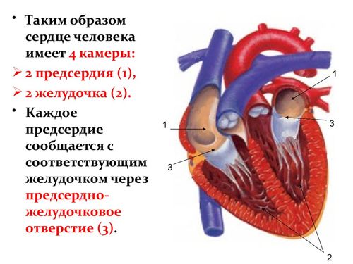 В человеческом сердце расположены четыре камеры — два предсердия и два желудочка. В каждом из отделов органа по две камеры, которые находятся друг над другом. Верхние камеры называются предсердиями, их часто называют «ушками» из-за их формы; они представляют собой резервуары с тонкими стенками, куда поступает кровь из вен. Нижние камеры — это желудочки, обладающие толстыми стенками, которые выполняют функцию насоса, перекачивая кровь в артерии. Размеры желудочков различаются: левый желудочек значительно толще и объемнее, с более развитыми мышечными волокнами, так как он отвечает за прокачку крови в большой круг кровообращения. Правая сторона сердца менее развита и перекачивает кровь, обогащенную кислородом, к легким для дальнейшего насыщения. Все камеры сердца разделены перегородками.