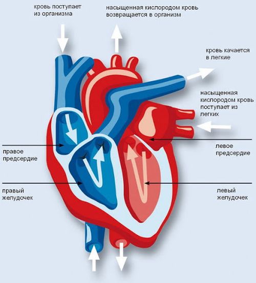 Сначала сокращается правое предсердие, выталкивая кровь в правый желудочек. Затем сокращается левое предсердие. После этого оба предсердия расслабляются, вновь заполняясь венозной кровью. В это время желудочки перекачивают физиологическую жидкость в легкие для обогащения кислородом, а затем в большой круг кровообращения. Таким образом, правая часть сердца принимает отработанную кровь, отправляет ее в легкие, а затем обогащенная кислородом кровь возвращается в левую часть и выбрасывается в общий кровоток.