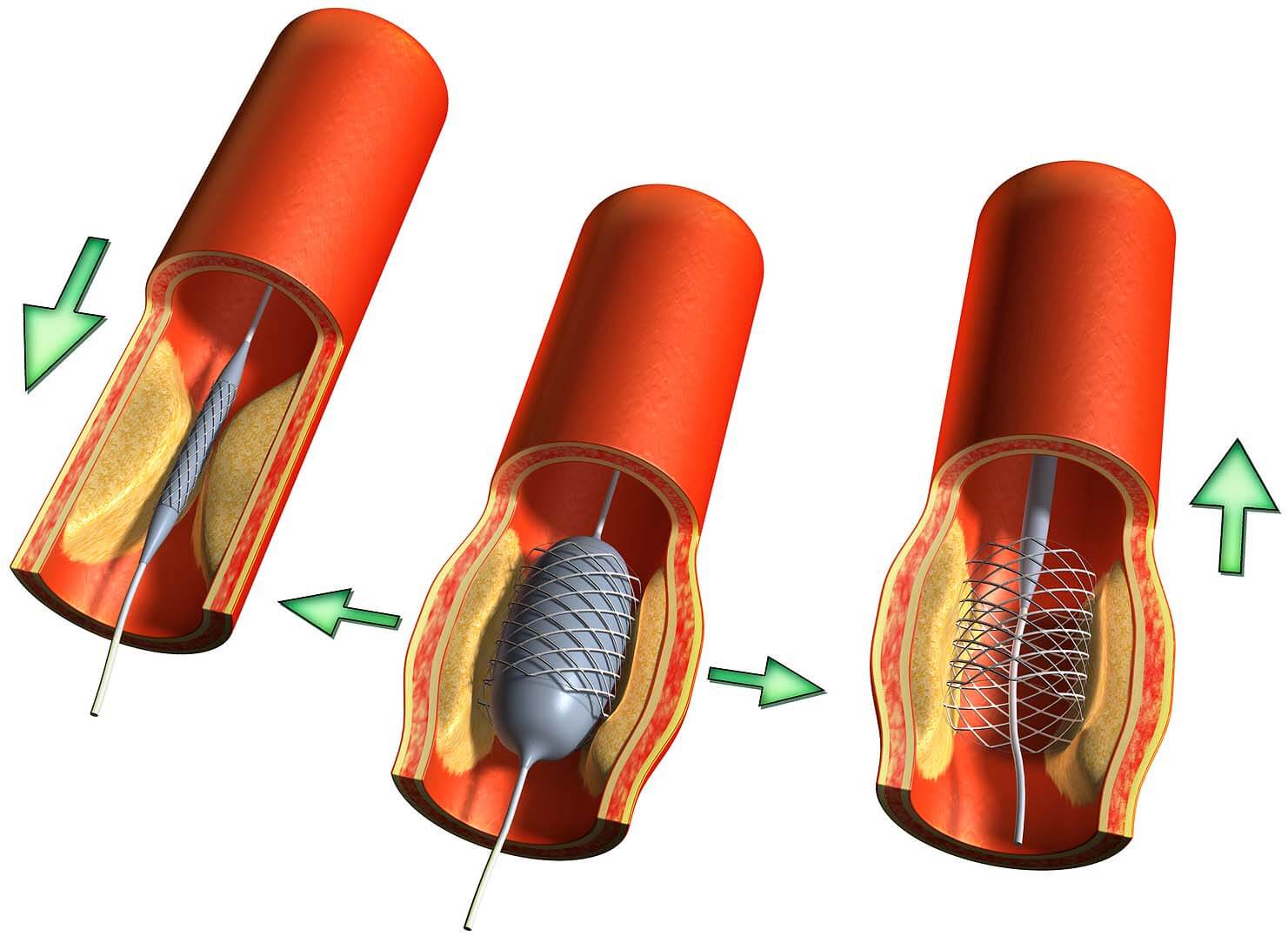 После того как диаметр артерии восстановлен, баллон сдувается и удаляется через трубку. Для предотвращения повторного сужения в пораженную область сосуда через катетер вводится стент — трубка в форме сетки, которая фиксируется на месте раздавленной бляшки. Затем катетер и трубка извлекаются. Основная задача стента заключается в поддержании диаметра артерии и предотвращении повторного образования бляшек.