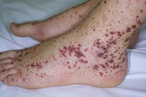 - кожные высыпания (чаще всего пурпурного цвета) на коже или конечностях;