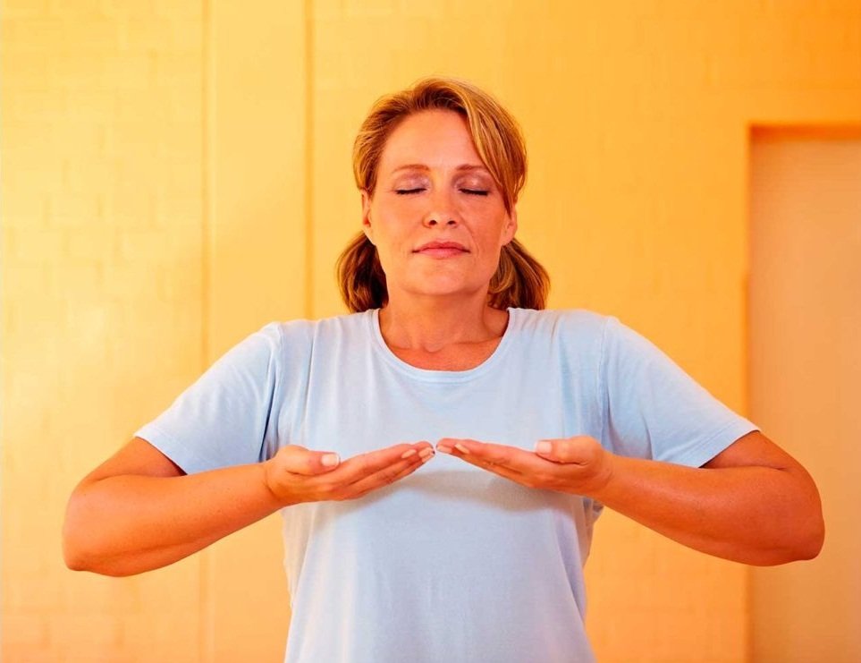 - Сделайте глубокий и медленный вдох, поднимая руки вверх. Задержите дыхание на несколько секунд, затем медленно выдохните, одновременно сгибая руки в локтях и резко опуская их, слегка ударяя по бокам груди.