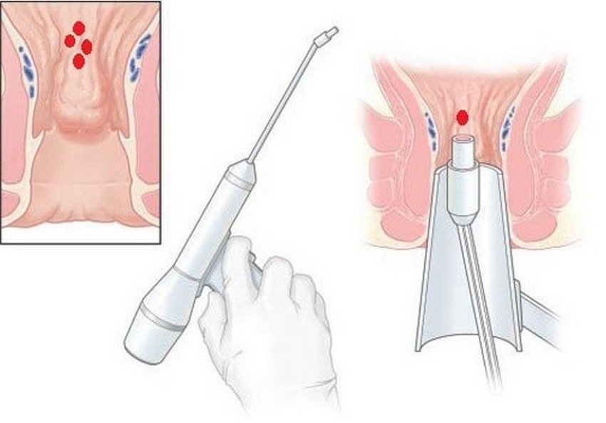 | Низкая вероятность повреждения соседних тканей. | Процедура не даст результата при запущенной стадии геморроя. |