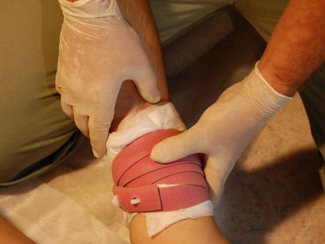 - Туго обматывайте моток бинта вокруг конечности вторым бинтом и фиксируйте его.