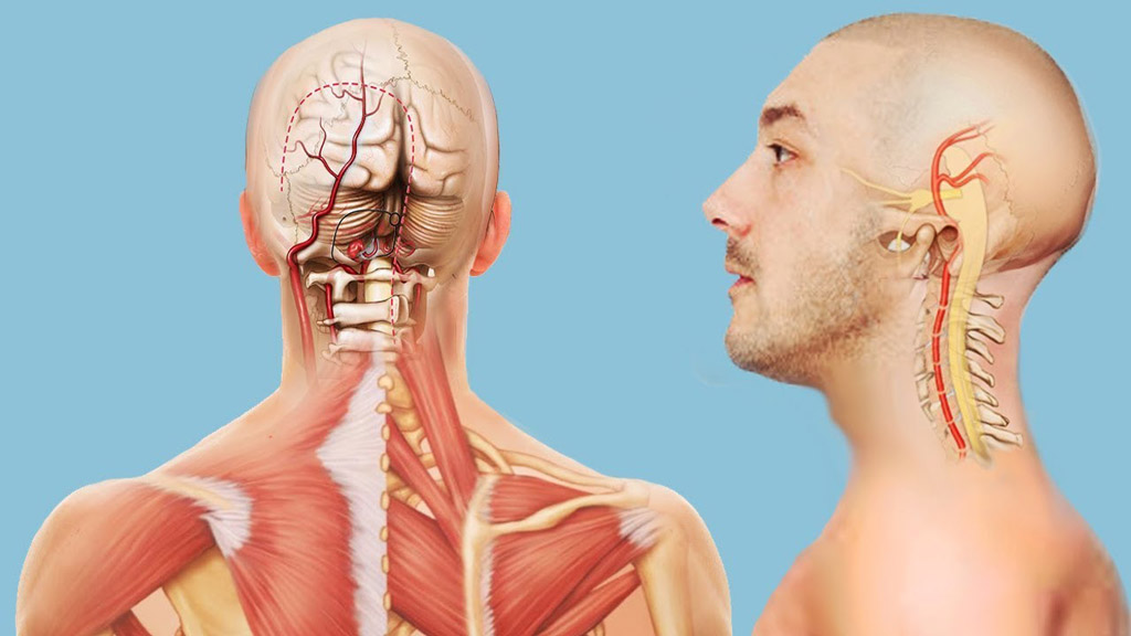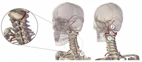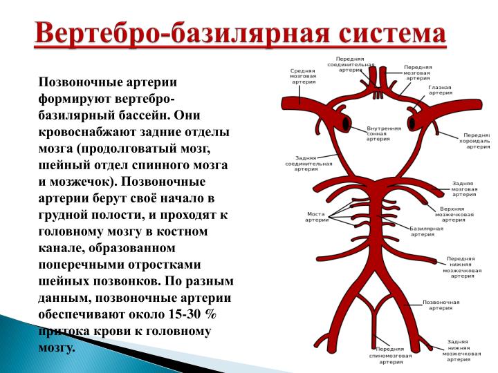 Артерии, которые обеспечивают мозг питательными веществами, отходят от правой безымянной и левой подключичной артерий. Они проходят через отверстия между отростками шейных позвонков и проникают в череп, где объединяются в одну базилярную артерию. Эта артерия располагается в нижней части ствола мозга и составляет вертебро-базилярную систему, которая отвечает за 30% общего кровоснабжения мозга.