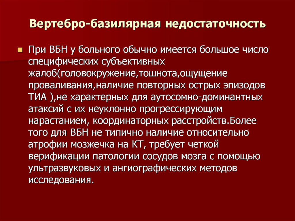 Многообразие симптомов вертебробазилярной недостаточности (ВБН) не обладает яркой специфичностью, что может затруднить диагностику, так как их можно перепутать с проявлениями других заболеваний. Однако опытный невропатолог, собирая анамнез и внимательно анализируя жалобы пациента, обязательно заподозрит ВБН и направит на комплексное обследование.