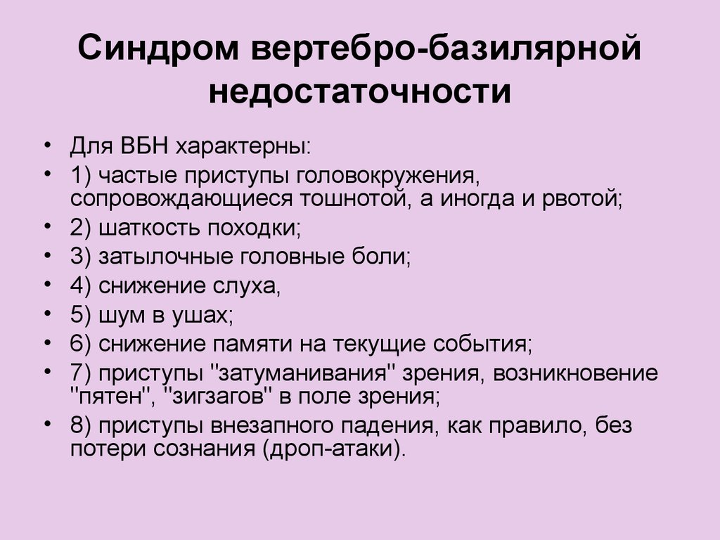 Кровоток в любом участке вертебробазилярной системы может уменьшаться из-за внешнего давления или сужения внутреннего просвета. Это приводит к нехватке питания для мозга, что, в свою очередь, вызывает определенные клинические симптомы. Наличие этих симптомов служит основанием для диагностики вертебробазилярной недостаточности и требует немедленного начала лечения.